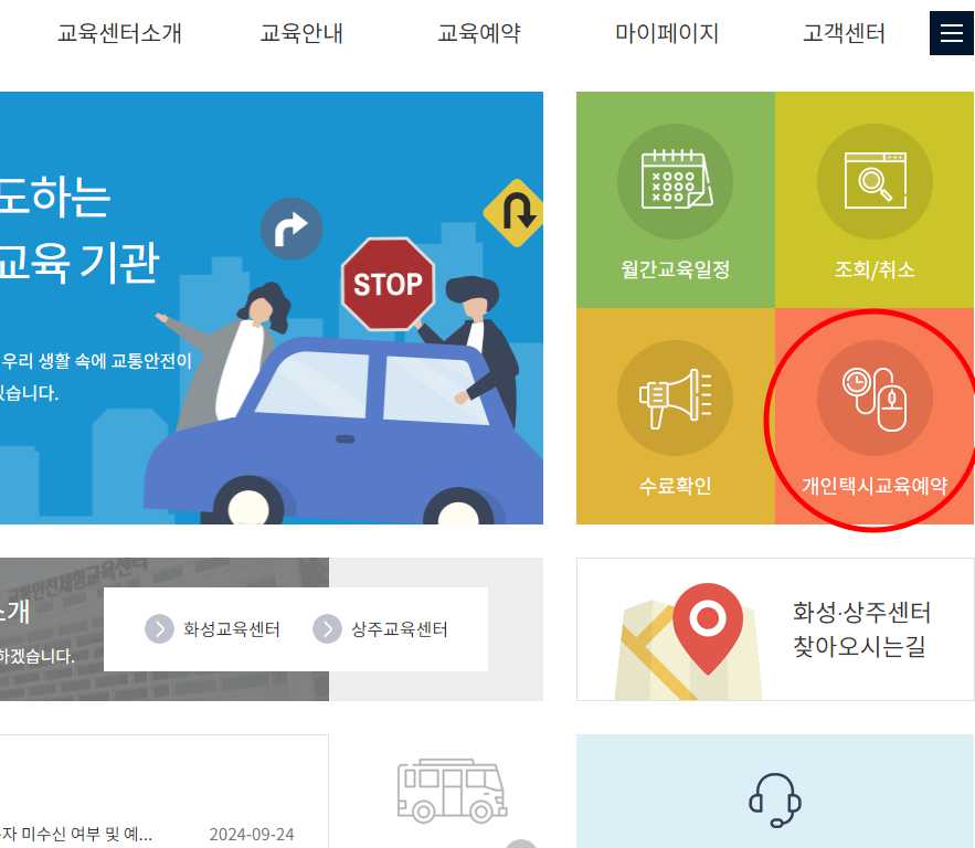 9) 먼저 다시 홈페이지 메인화면에서 '개인택시교육예약'을 클릭해 들어갑니다.