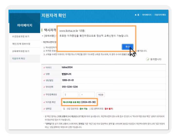 6) 그러면 지원자격 확인탭에 아이디와 성명 등이 나오게 되는데 '자격증 확인' 탭에 택시자격증 유효 확인으로 되어 있는지 확인합니다. 택시자격증이 유효해야지만 개인택시 양수교육을 접수할 수가 있습니다.