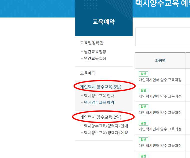 10) 왼쪽 교육예약 메뉴에 보면 개인택시 양수교육(5일)과 경력자 양수교육(2일)로 나누어져 있으니 해당하는 교육을 선택해 들어갑니다.