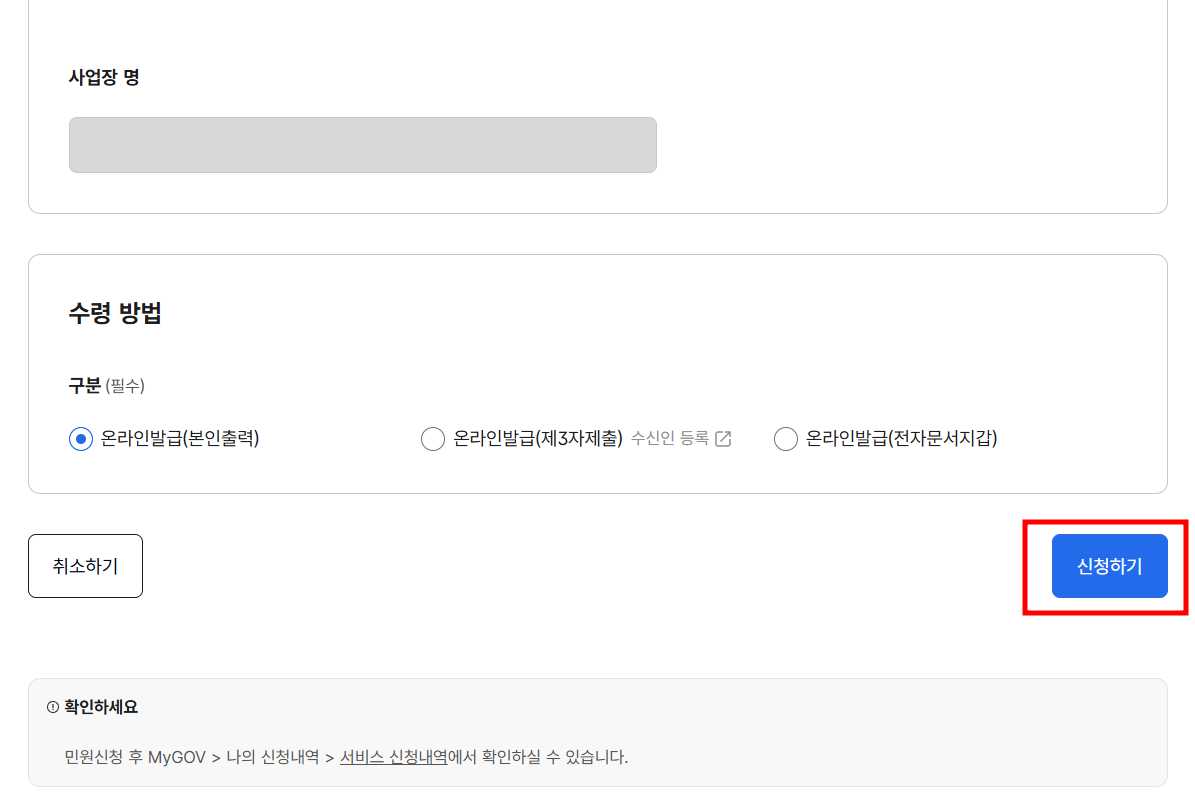 6) 온라인발급을 선택하고 '신청하기'를 누릅니다.