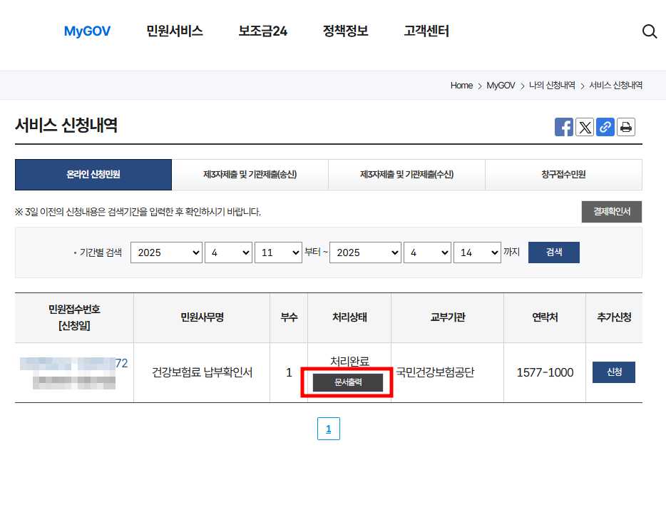 7) 바로 1초만에 발급이 완료되고 신청내역 창에서 '문서출력'을 누릅니다.