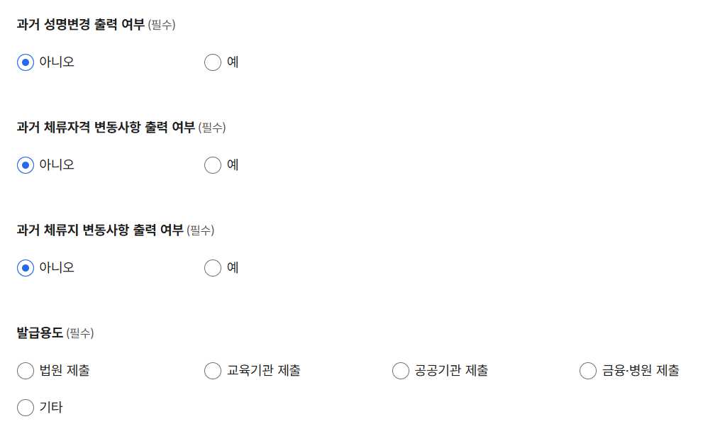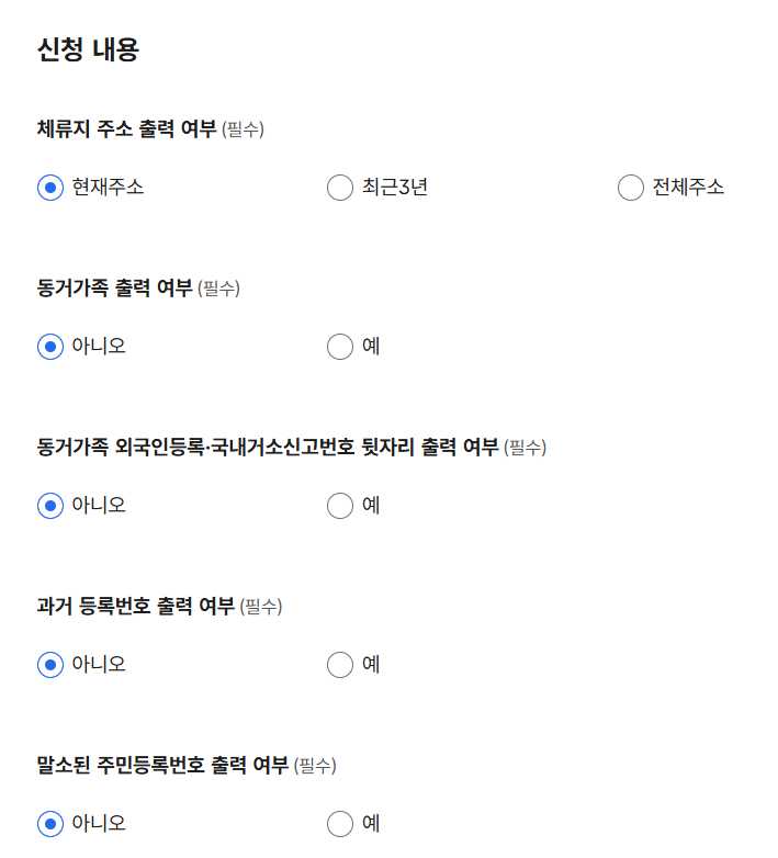 4) 신청인 정보를 입력 및 확인해줍니다. 그리고 체류지주소, 동거가족 등의 서류에 표시할 내용을 선택을 해주고, 발급용도까지 선택을 해주면 됩니다.
