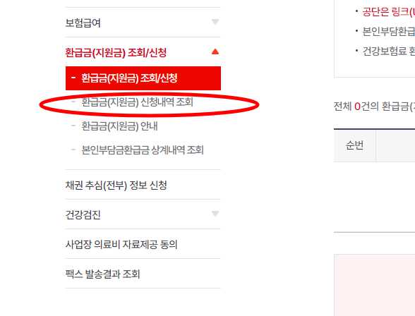3) 왼쪽 메뉴에 환급금(지원금) 조회/신청을 들어갑니다.