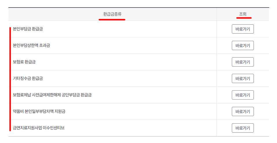 7) 그러면 본인부담금, 본인부담상한액 초과금, 보험료, 기타징수금 등 종류별로 바로가기를 누르면 바로 조회를 해볼 수 있으니 환급금을 전부 조회하면 됩니다.