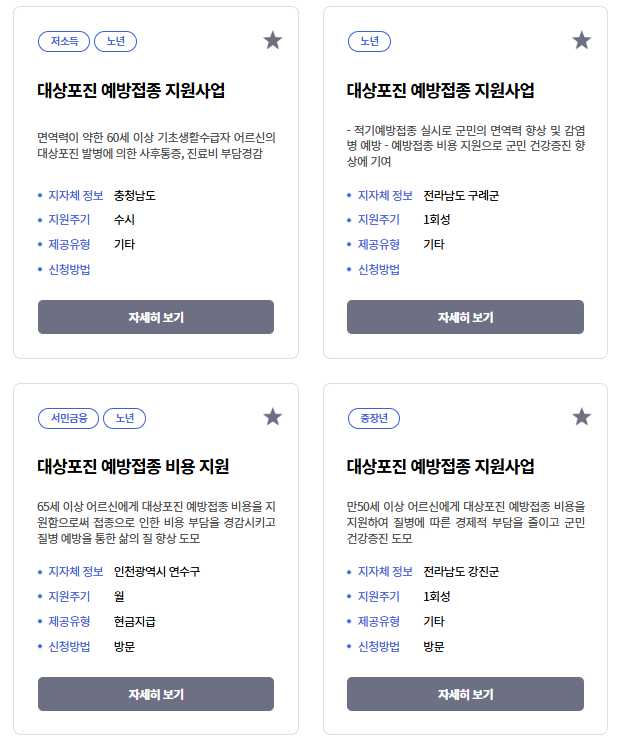 대한민국 공식 누리집인 복지로 홈페이지에서 지자체에 따라 대상포진 예방접종 무료 지원사업 내용을 확인하실 수 있습니다.