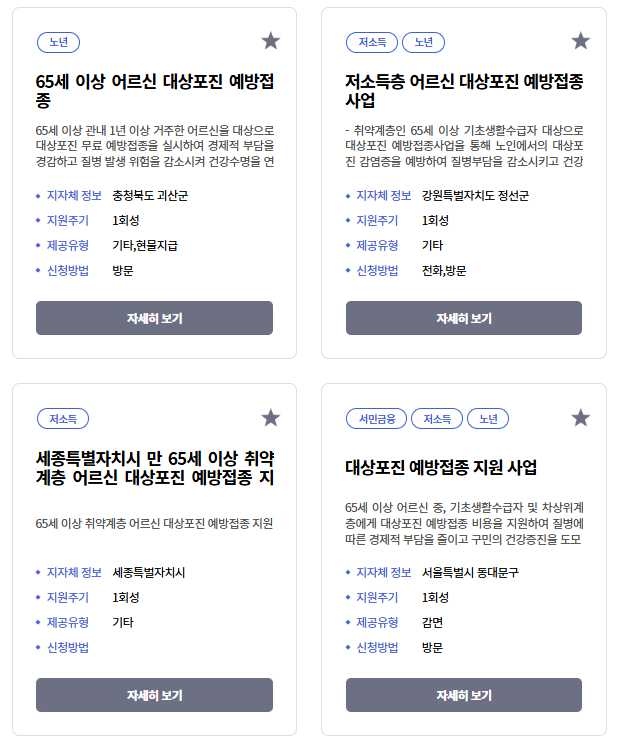 각 지자체에서는 나이와 조건에 따라서 대상포진 예방접종을 무료로 지원을 하거나 금액을 지원하는 사업을 많이 진행하고 있습니다.