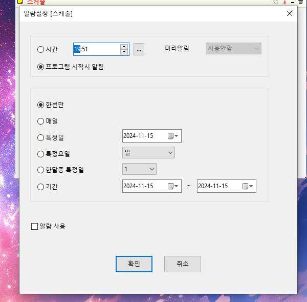8) 그리고 알람기능도 이용할 수 있습니다. 원하는 날짜와 시간을 지정하고 알람 사용하기를 누른 후 확인을 하면 지정한 날짜와 시간에 알림이 울립니다.
