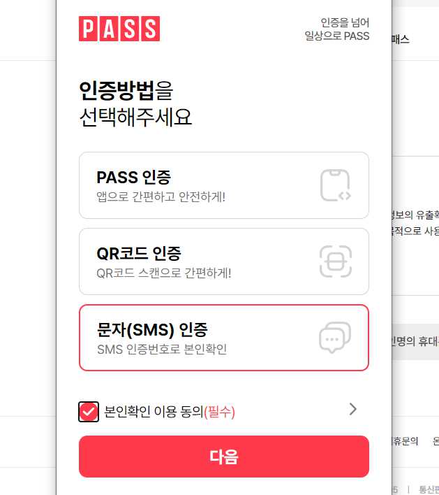 - pass, qr코드, 문자 등 원하는 인증을 누르고 다음을 누릅니다.