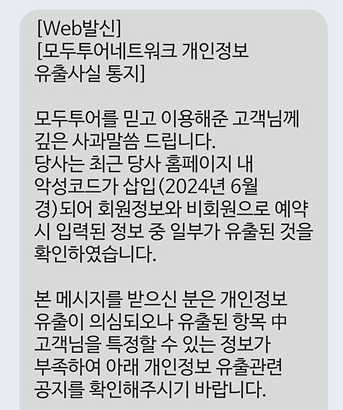 그래서 모두투어에서는 네트워크 개인정보유출에 관련된 문자를 발송을 하였는데요, 회원정보와 예약할때 입력했던 정보가 유출이 되었다고 합니다.
