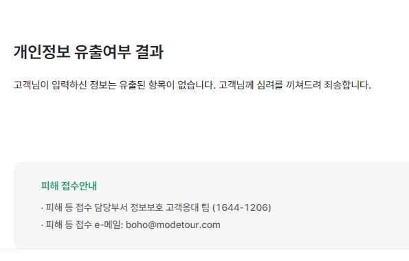 모두투어 홈페이지에서 제공하는 유출여부 확인서비스를 이용하면 내 개인정보가 유출되었는지 조회해볼 수 있습니다.