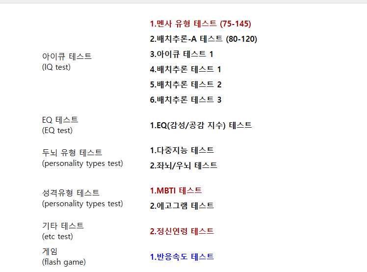 그리고 아이큐 테스트 뿐만 아니라 멘사, 배치, EQ, 좌뇌/우뇌 등, 심리테스트까지 해볼 수 있는 사이트도 있으니 참고 하시기 바랍니다.