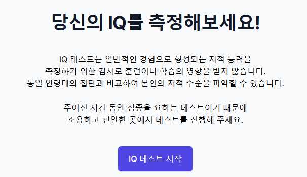 인터넷에서는 수많은 무료 아이큐 테스트 사이트가 있는데요, 간단하게 아이큐를 측정할 수 있지만 과학적 근거나 정확도가 떨어질 수도 있으니 재미로만 보시는걸 추천드립니다. 좀 더 확실하고 정확한 수치를 알고 싶은 분들은 전문가를 통해서 신뢰할 수 있는 기관에서 검사를 하시기 바랍니다.