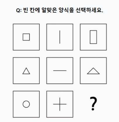 문제 속의 규칙을 파악하고 논리적으로 해결책을 찾는 능력과 도형이나 패턴 등을 통해서 시각적인 정보처리 능력과 공감각적 능력을 테스트하게 됩니다.
