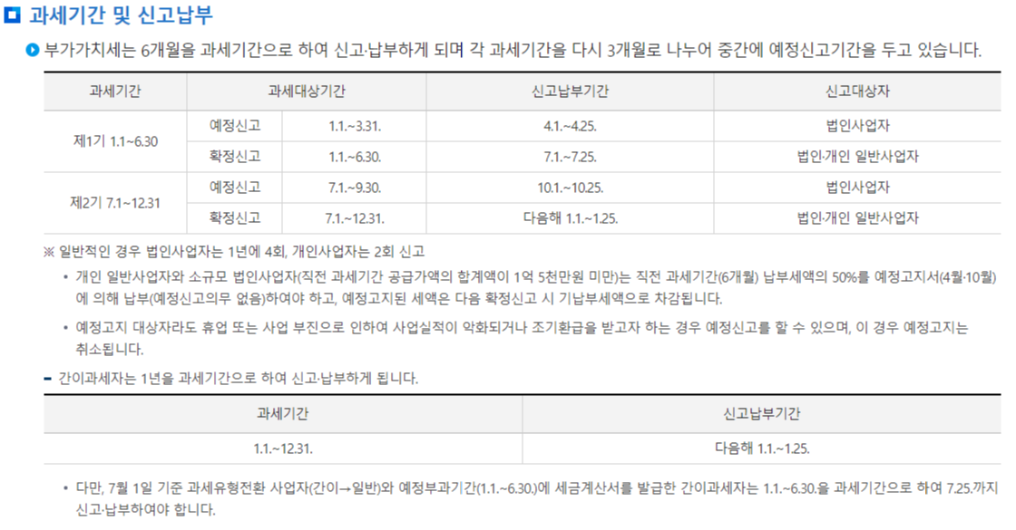 * 간이과세자의 경우에는 1월 1일 ~ 12월 31일까지 1년을 과세기간으로 하여 다음 해 1월 1일 ~ 1월 25일까지 신고납부 (연 1회)