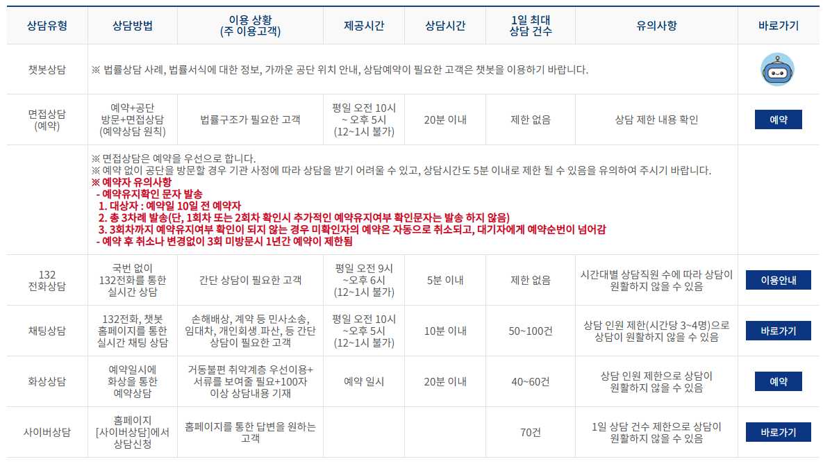 대한법률구조공단에서 법률상담을 받는 방법은 직접 만나는 면접상담과 비대면으로 진행하는 채팅, 화상, 온라인 상담 그리고 전화상담까지 모두 가능합니다.