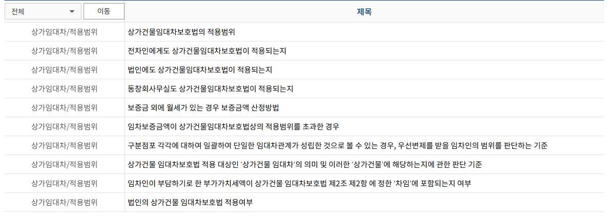 주택임대차, 상가임대차, 손해배상, 민사, 물권, 채권, 계약, 상속 등의 부동산 법률 정보 메뉴 중에 궁금하신 주제를 선택해줍니다.