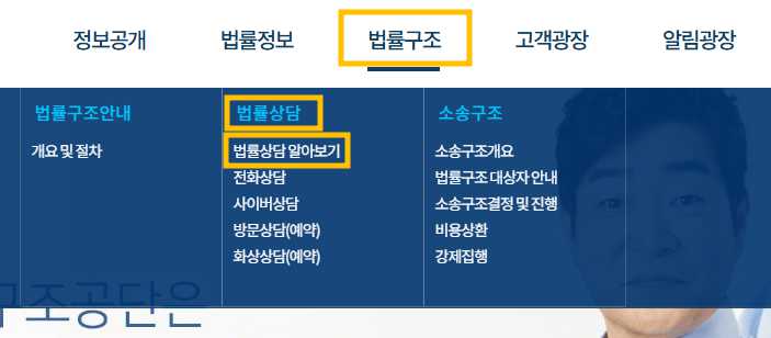 1) 해당 홈페이지 상단메뉴에서 법률구조 > 법률상담 > 법률상담 알아보기로 들어갑니다.