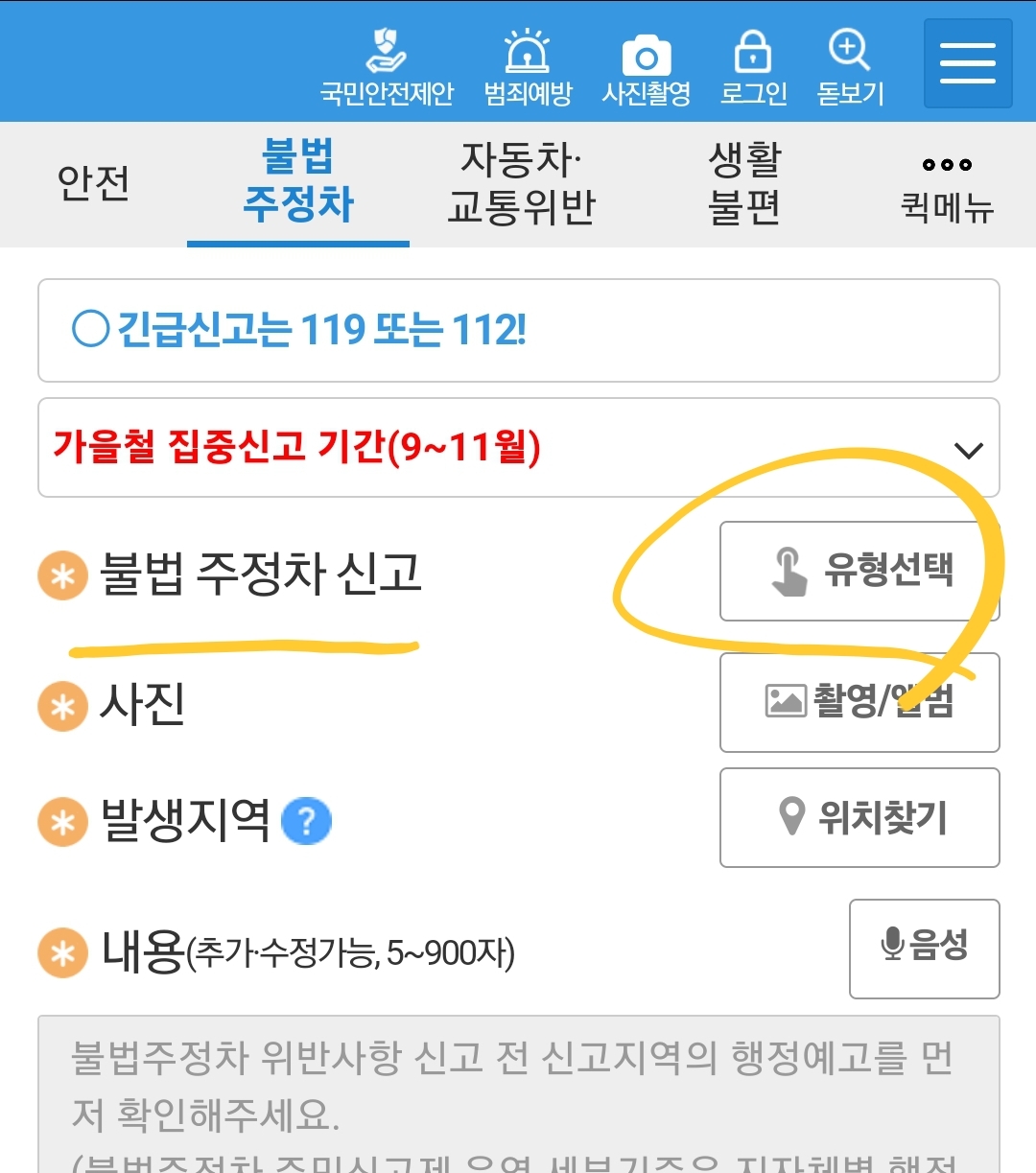 3) 불법 주정차 신고 탭에 '유형선택'을 눌러서 들어갑니다.