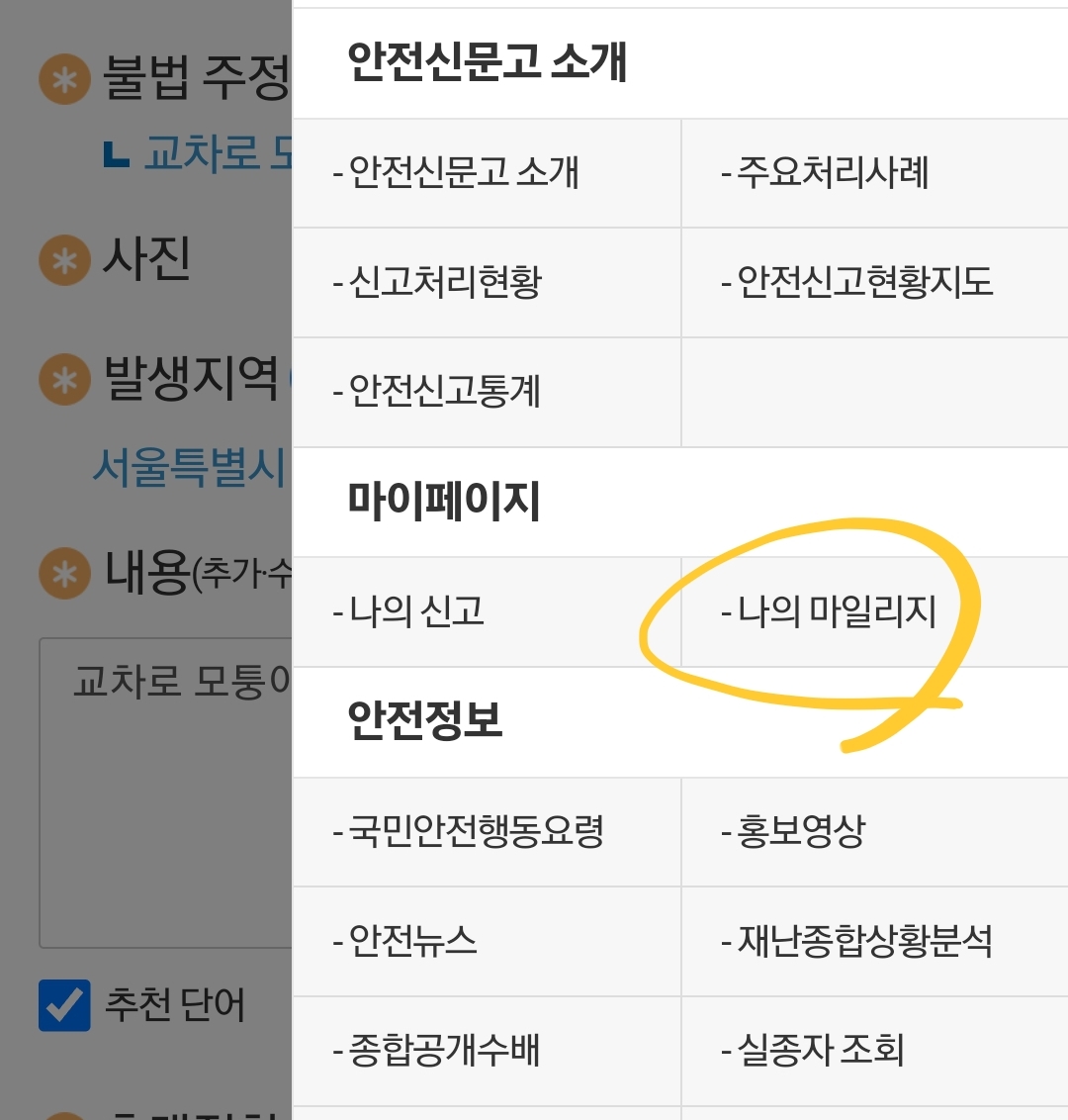 신고를 해서 포상금으로 마일리지를 받으셨다면, 안전신문고 어플에서 우측 상단에 메뉴를 눌러서 마이페이지 > 나의 마일리지를 눌러서 마일리지 현황을 확인할 수 있습니다.