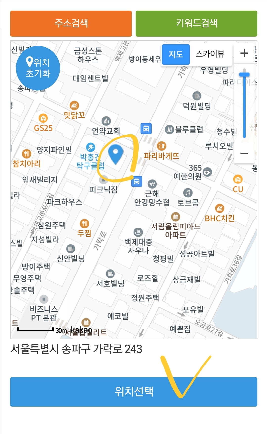 11) 최대한 정확하게 위치를 맞춰준 다음에 위치선택을 누릅니다.
