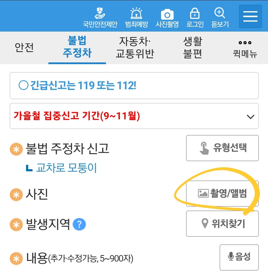 8) 사진촬영이나 앨범을 눌러서 사진파일을 첨부합니다. 이때 번호판과 주변 상황이 잘 나오게 사진을 한장 찍은 뒤에 1~2분이 지나서 동일한 위치에서 동일한 각도로 다시 찍어줍니다.