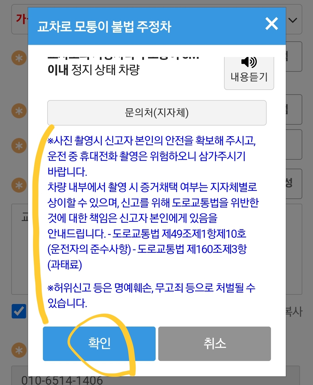 5) 위반사항에 따라 안내메시지를 확인하실 수 있습니다. 안내사항을 확인하고 '확인' 버튼을 누릅니다.