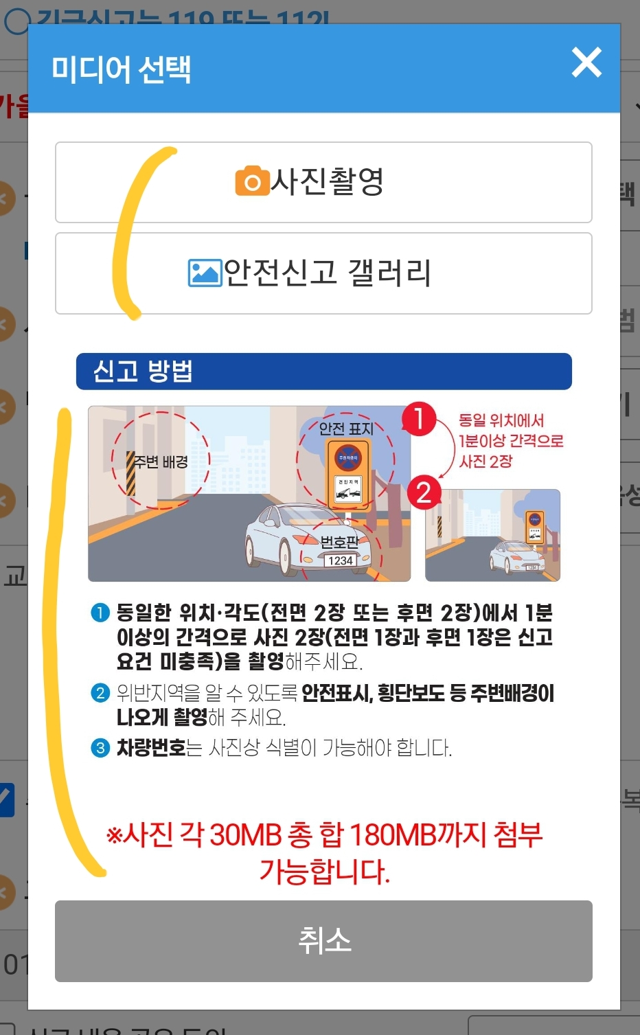 8) 사진촬영이나 앨범을 눌러서 사진파일을 첨부합니다. 이때 번호판과 주변 상황이 잘 나오게 사진을 한장 찍은 뒤에 1~2분이 지나서 동일한 위치에서 동일한 각도로 다시 찍어줍니다.