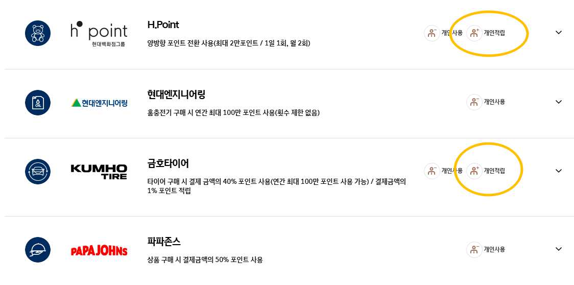 메뉴에 적립처 확인에서 전체, 개인, 법인을 선택하신 뒤에 검색을 누르거나 제휴 업체명을 바로 입력해서 검색을 할 수도 있습니다.