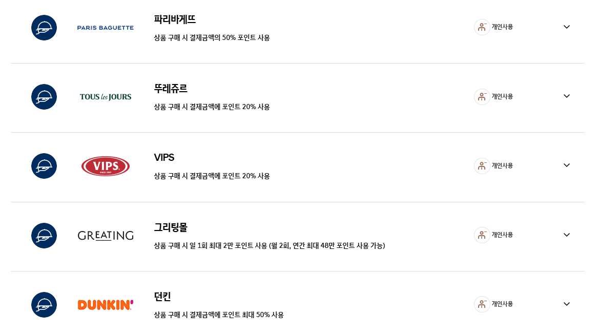 - 포인트 사용처 - CGV, 롯데시네마, 파리바게트, 빕스, 던킨도너츠, LG전자, CU편의점, 현대몰, 면세점, 타이어샵, 놀이공원 등