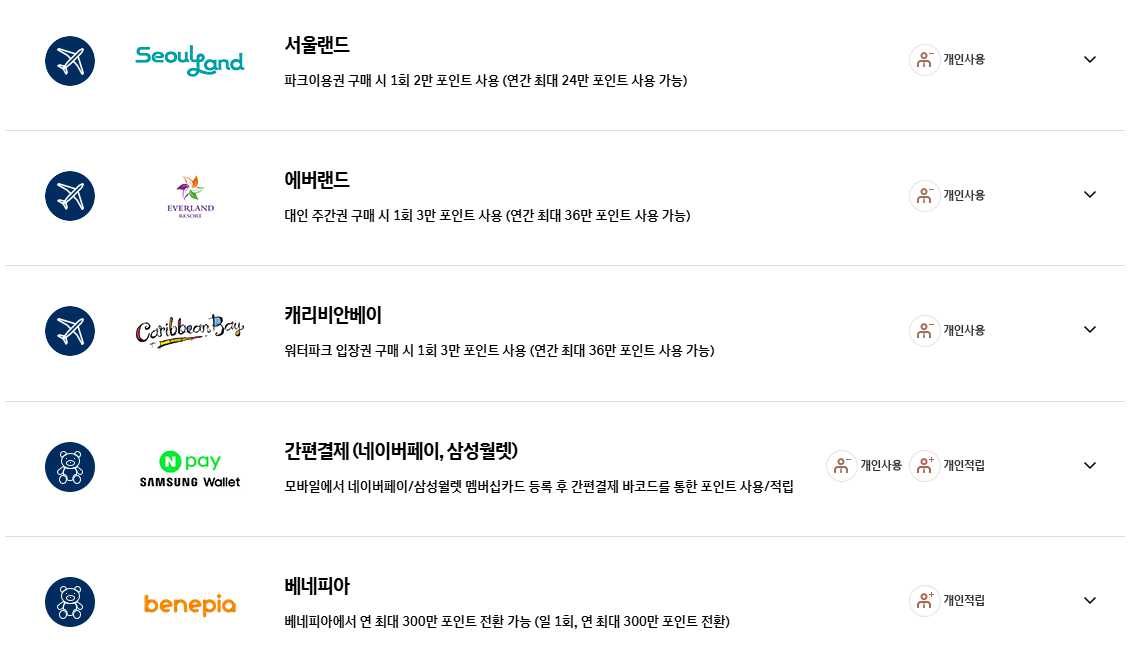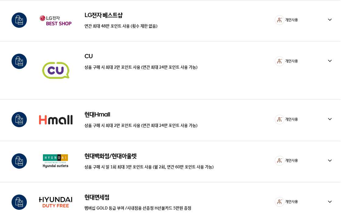- 포인트 사용처 - CGV, 롯데시네마, 파리바게트, 빕스, 던킨도너츠, LG전자, CU편의점, 현대몰, 면세점, 타이어샵, 놀이공원 등