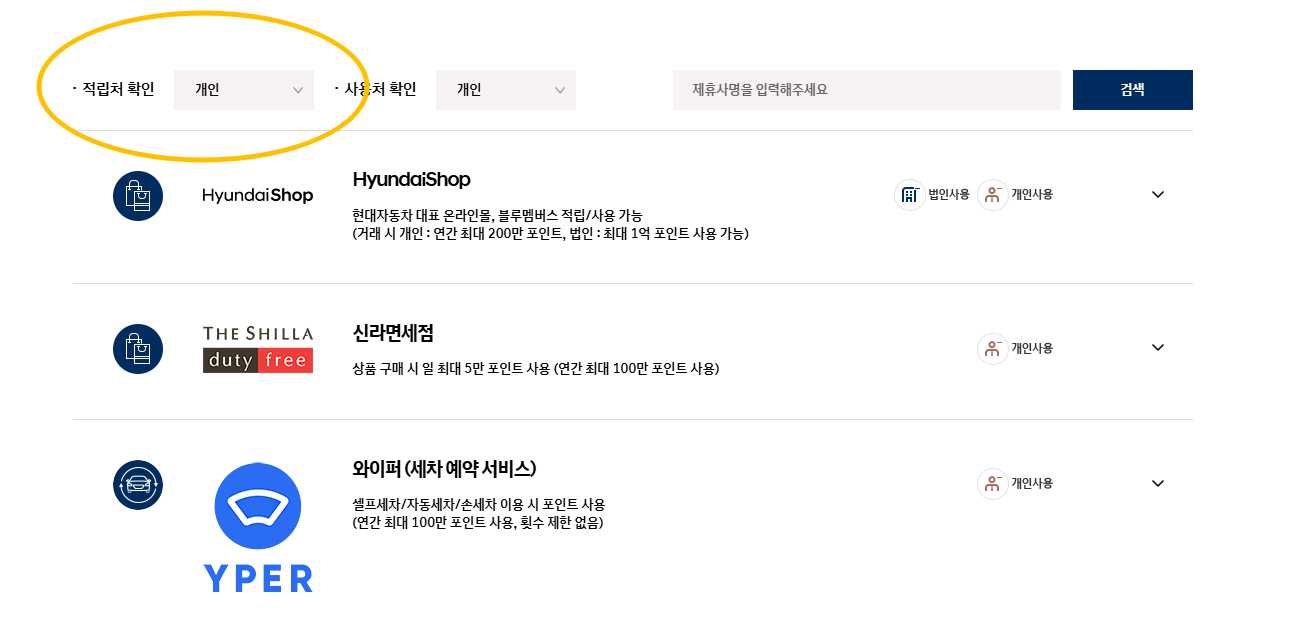 메뉴에 적립처 확인에서 전체, 개인, 법인을 선택하신 뒤에 검색을 누르거나 제휴 업체명을 바로 입력해서 검색을 할 수도 있습니다.