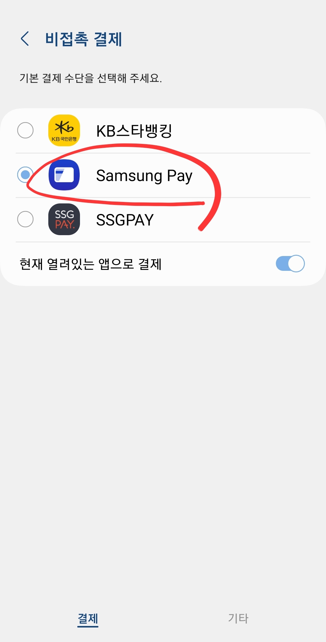 4.비접촉결제에서 기본 결제 수단을 삼성페이로 지정을 해줍니다.