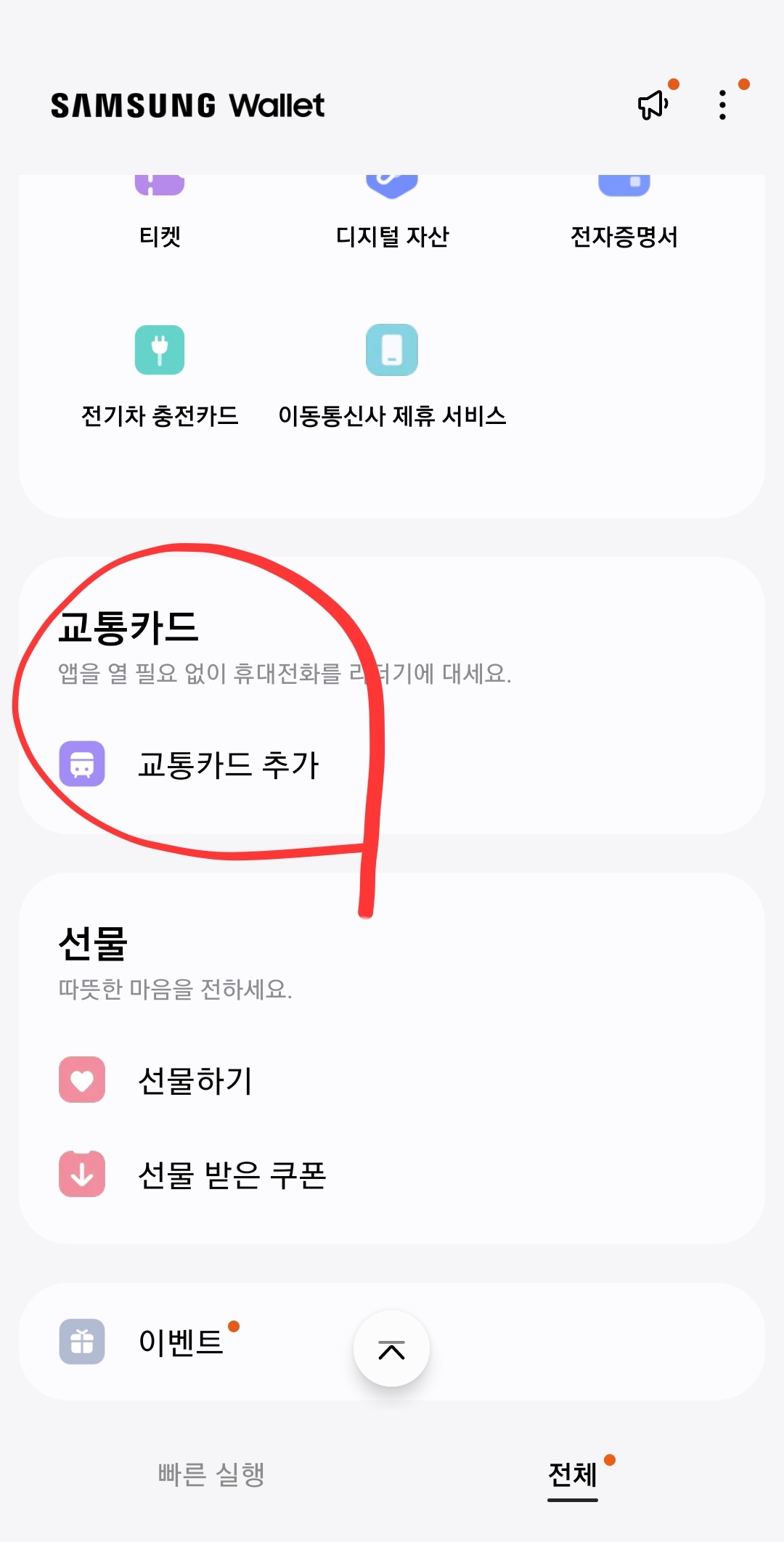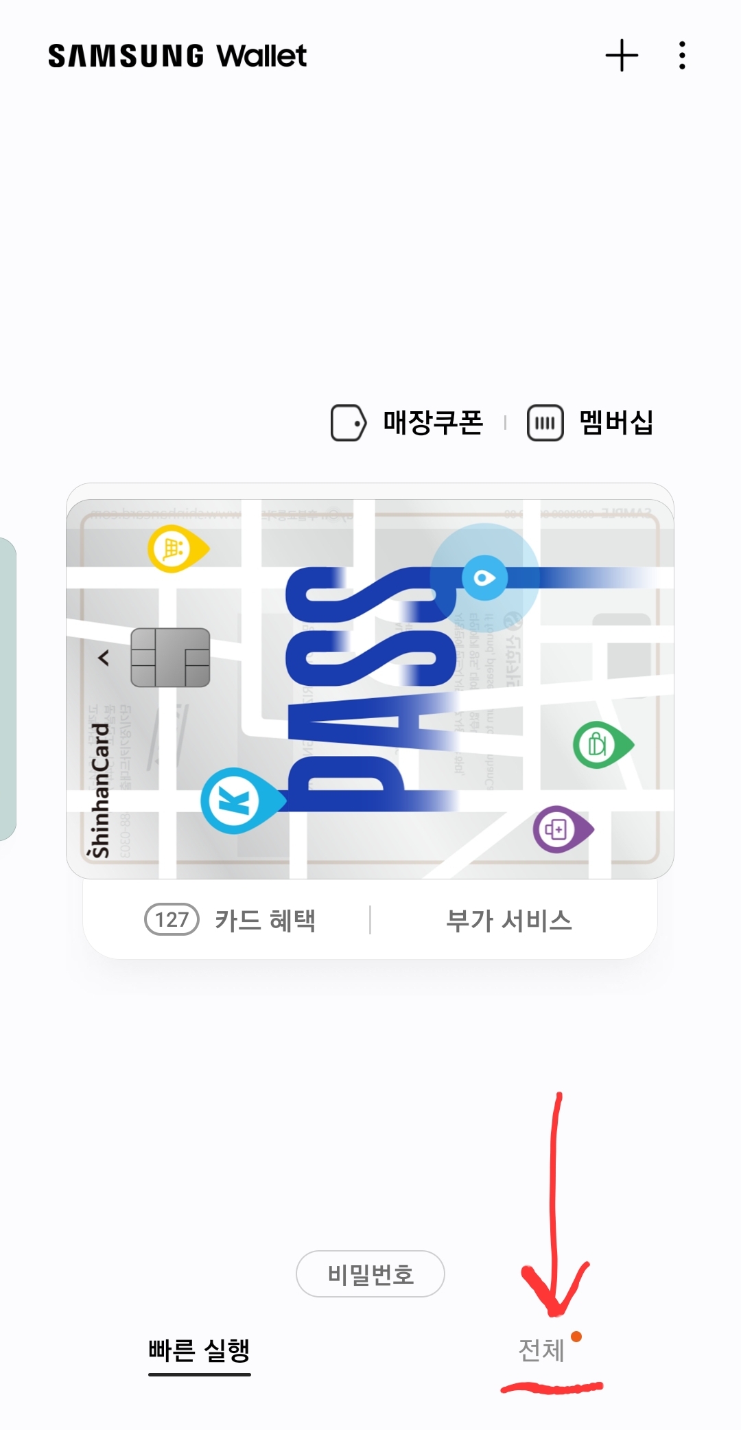 2. 삼성월렛을 실행해서 메인화면에서 우측 하단에 '전체' 버튼을 눌러줍니다.