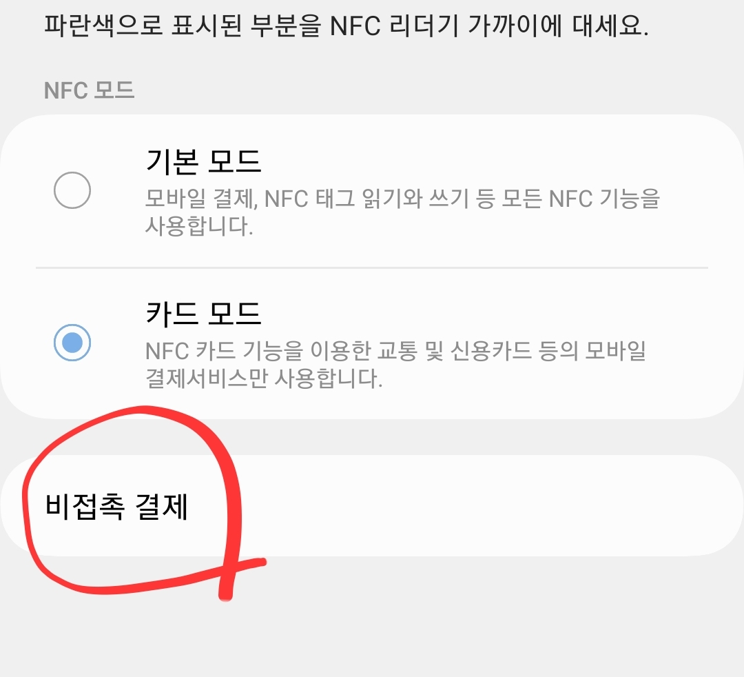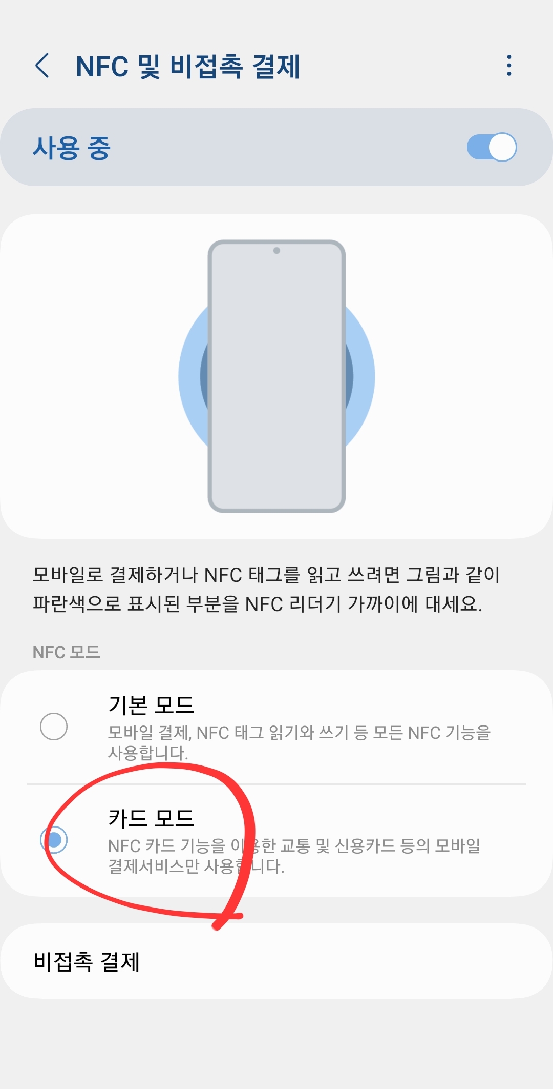 2.그럼 사진과 같은 'NFC 및 비접촉 결제' 창이 열리는데요, 여기서 사용을 하실때 이 NFC 기능이 켜져 있어야 한다는 점은 기억해주시기 바랍니다. 기본모드와 카드모드가 있는데, '카드모드'로 사용하시면 됩니다. 기본모드도 가능하나 배터리가 더 빨리 달기 때문에 카드모드를 사용합니다.