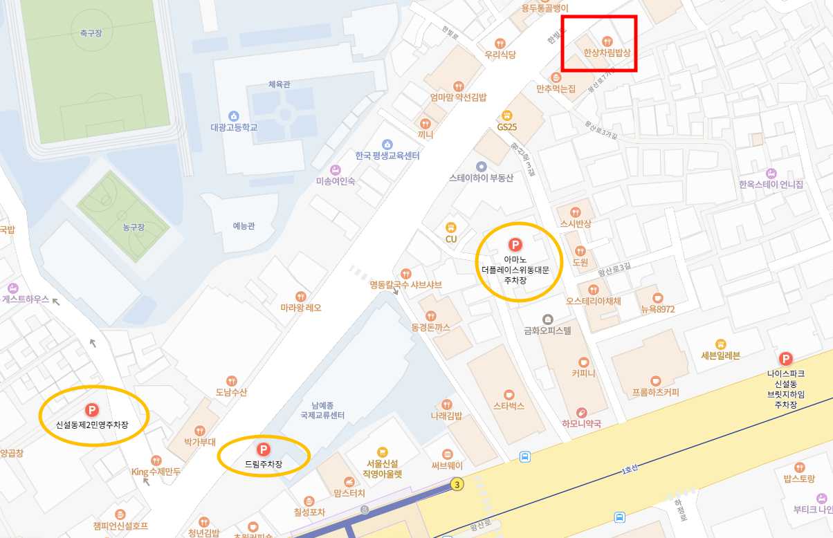 한상차림밥상은 주차 공간이 마련되어 있지 않기 때문에 방문 시에 주변 주차장을 이용하셔야 합니다.