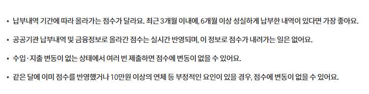 - 카드·예금·대출 실적을 제1금융권에서 쌓아야 점수에 긍정적입니다.