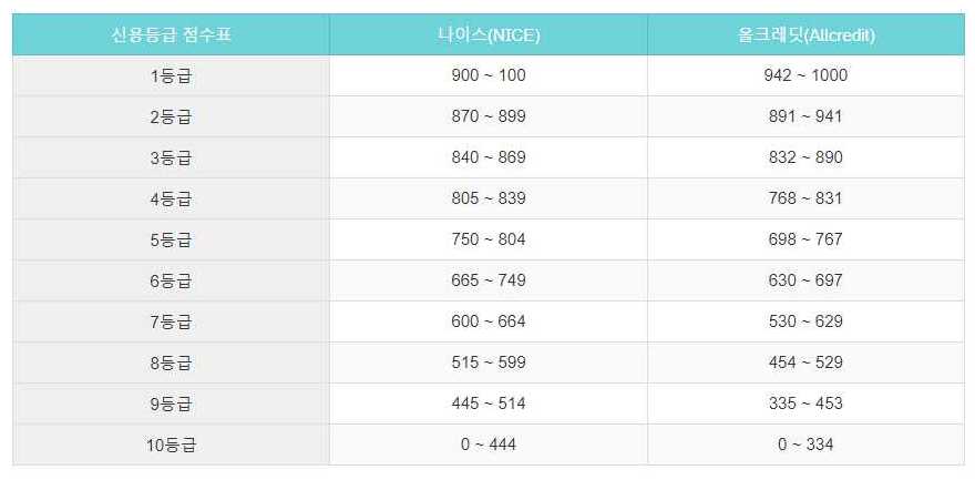 2021년 이후 기존 1–10등급은 1–1,000점의 신용점수제로 전환됨
