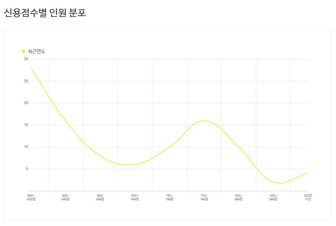 KCB기준 우리나라에서 신용등급 평균 점수를 따져보면, 950점이상의 비율이 가장 많고, 다음은 900~950점과 700~750점대가 많습니다.