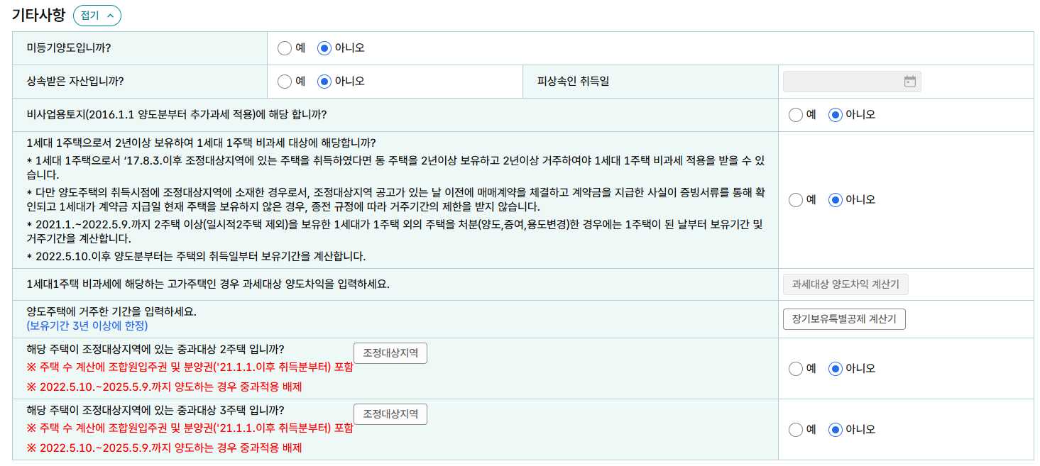 기타사항에 해당하는 것을 체크하시고 계산하기를 누르면 양도세를 빠르고 편리하게 계산해볼 수 있습니다.