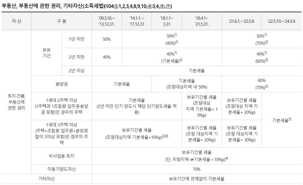 토지 및 건물과 부동산에 관한 권리 등 부동산의 세율은 보유기간과 조정대상지역 등에 해당하는지에 따라 추가적인 세율이 있습니다. 특히 등기를 하지않고 매도한 미등기양도자산 같은 경우에는 70%의 최고 세율이 부과됩니다.