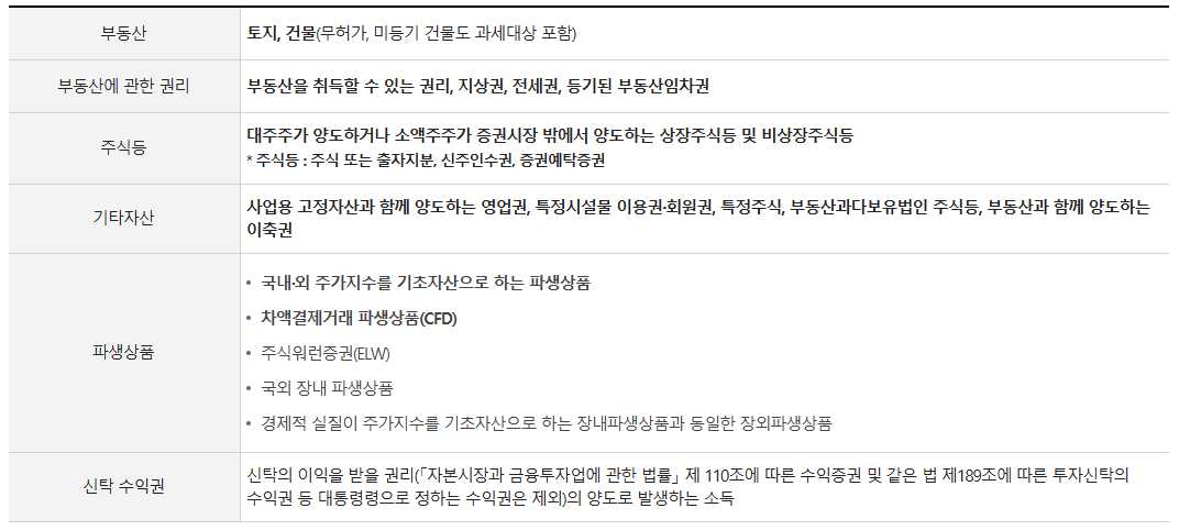 양도세 과세대상은 토지와 건물, 부동산을 취득할 수 있는 권리, 주식, 신탁수익권 등이 있습니다.