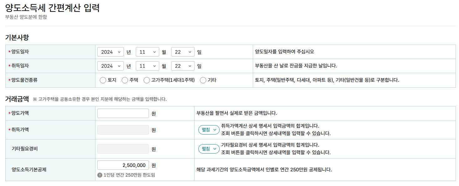 양도일자 및 취득일자, 토지, 주택, 건물 등을 선택하고 양도가액과 취득가액 및 기타필요경비를 입력합니다.