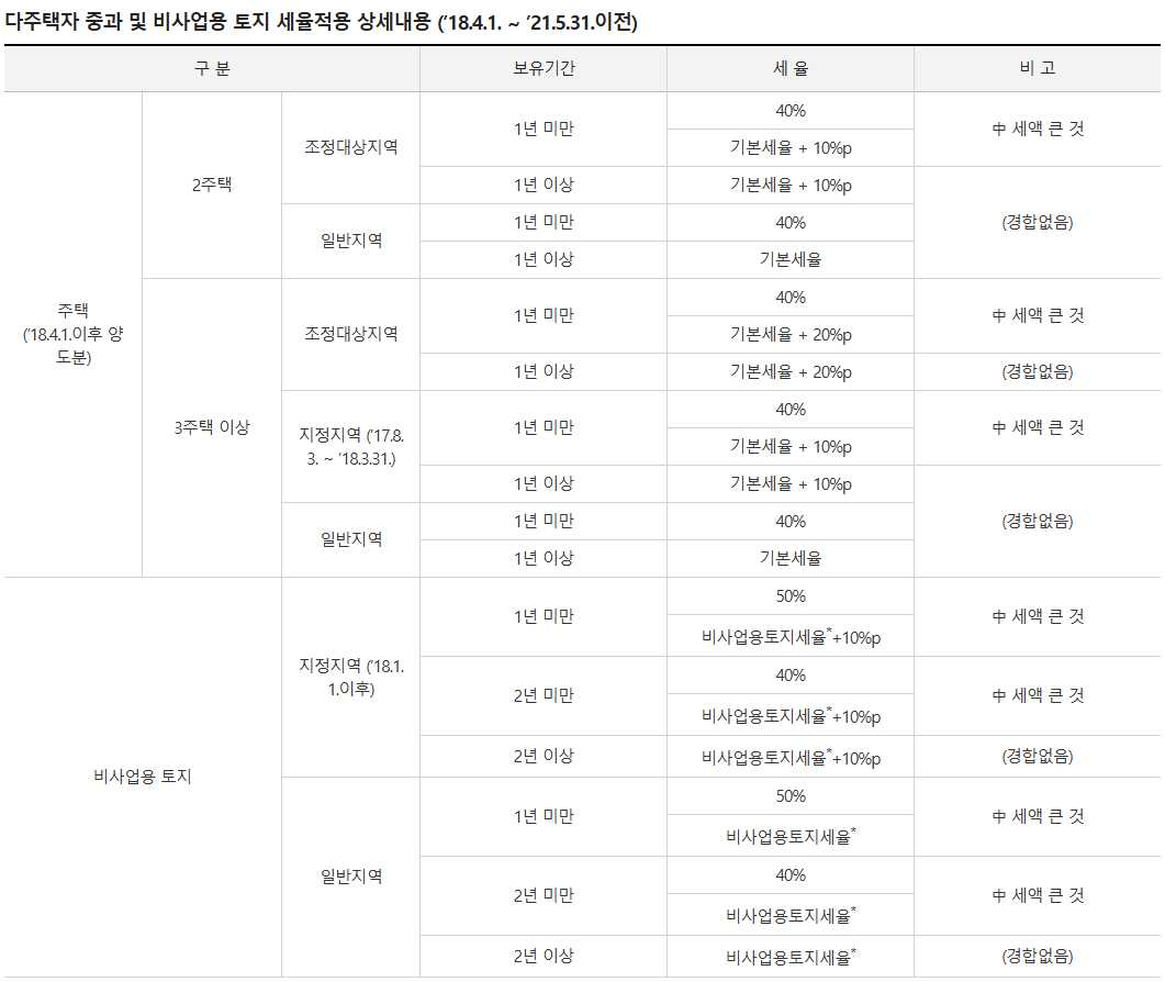 양도세 세율은 보유기간에 따라서 세율이 많이 차이가 납니다. 주택의 경우에는 기본적으로 1년미만인 경우에는 40%의 높은 세율을 부과하고 있는 것을 볼 수 있습니다.