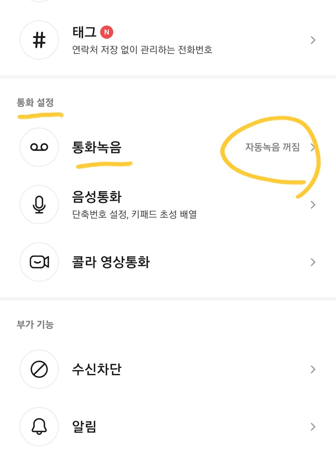 2) 통화설정 탭에 있는 통화녹음 기능을 꺼줍니다.