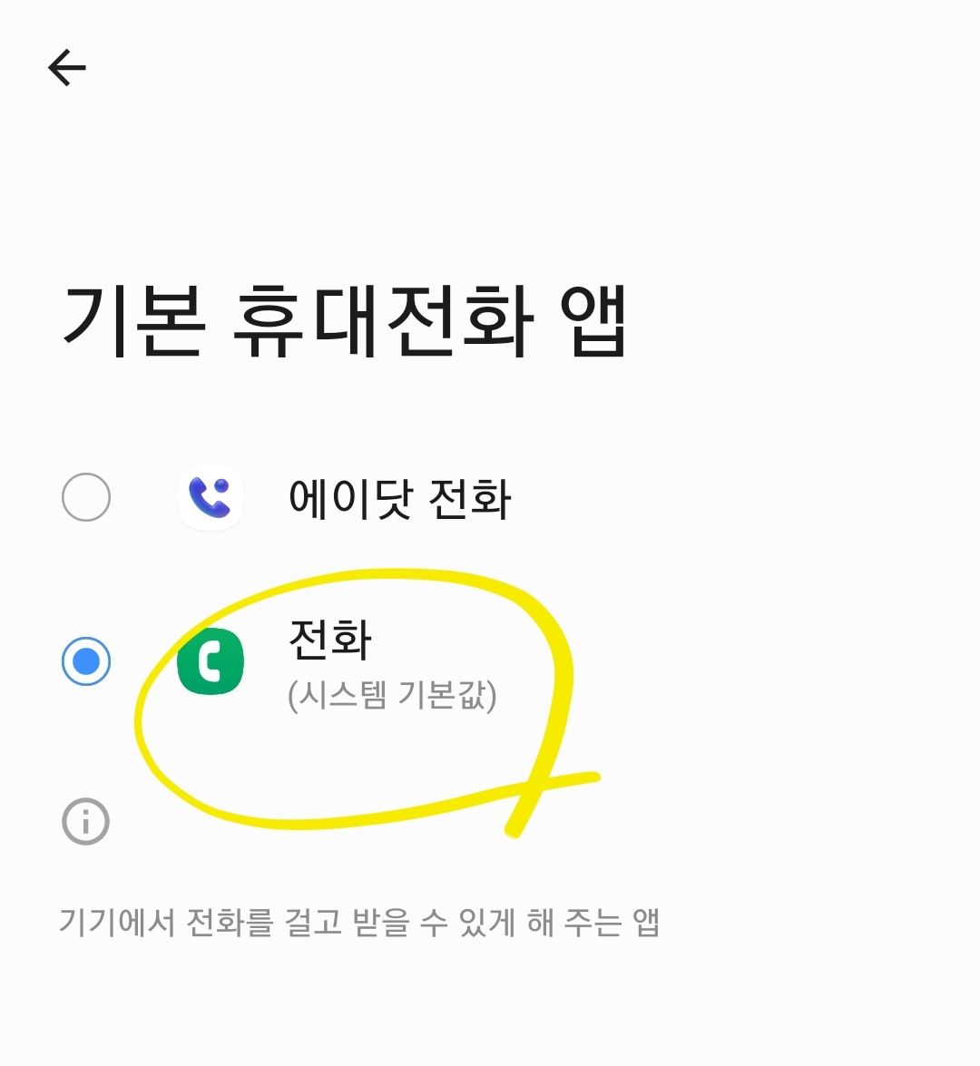 7) 스마트폰에 기본적으로 사용할 전화 앱을 원래 자체 전화 앱으로 다시 설정을 해줍니다.