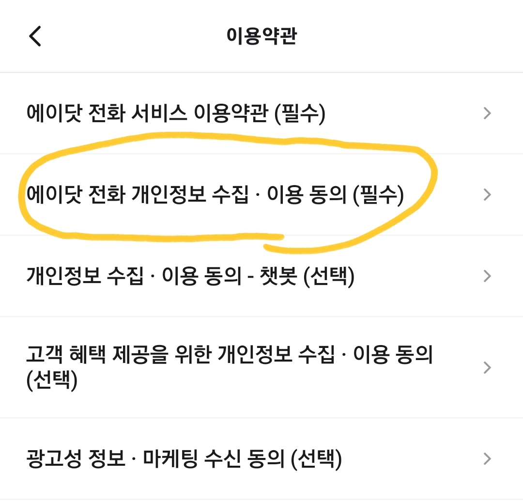 3) 이용약관에 에이닷 전화 개인정보 수집,이용 동의 필수 항목을 누릅니다.