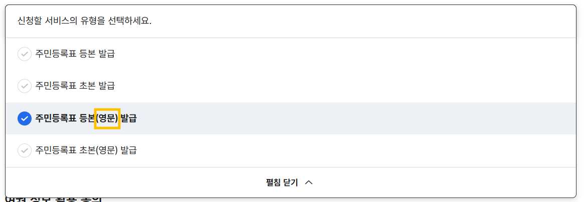 서비스 유형을 선택하는란에서 일반 주민등록등본 말고 영문으로 발급을 받아서 조회를 통해 영문이름을 확인할 수 있습니다.