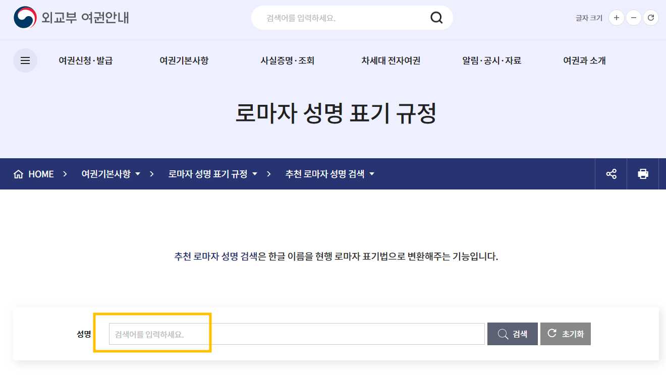 사실 가장 편한 방법은 여권 영문이름 변환기를 통해서 확인을 해볼 수도 있는데요, 외교부 홈페이지에서 로마자 성명 표기 규정으로 이름을 입력하면 현행 로마자 표기법으로 변환을 해주는 서비스도 있습니다.