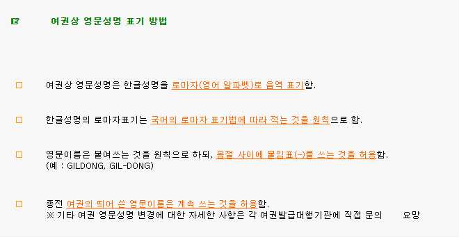 외교부 여권안내 공식홈페이지에서 로마자 성명 표기 규정 페이지로 들어갑니다.