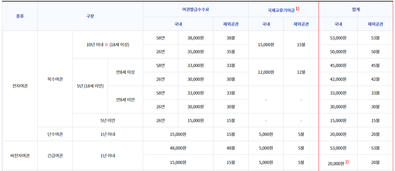 여권 발급 수수료는 상황에 따라 금액이 차이가 있으니 위의 사진을 참고하시기 바랍니다.